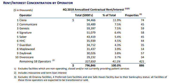 In addition to Orianna (formerly known as Ark) filing bankruptcy, OHI has reduced Signature’s rent by over $10 million, plus gave it a $10 million loan to pay for operating expenses. It has extended over $71 million in loans to Genesis Healthcare (GEN), with a substantial portion of the interest being paid-in-kind (PIK), which means that OHI is receiving warrants for GEN common shares.
